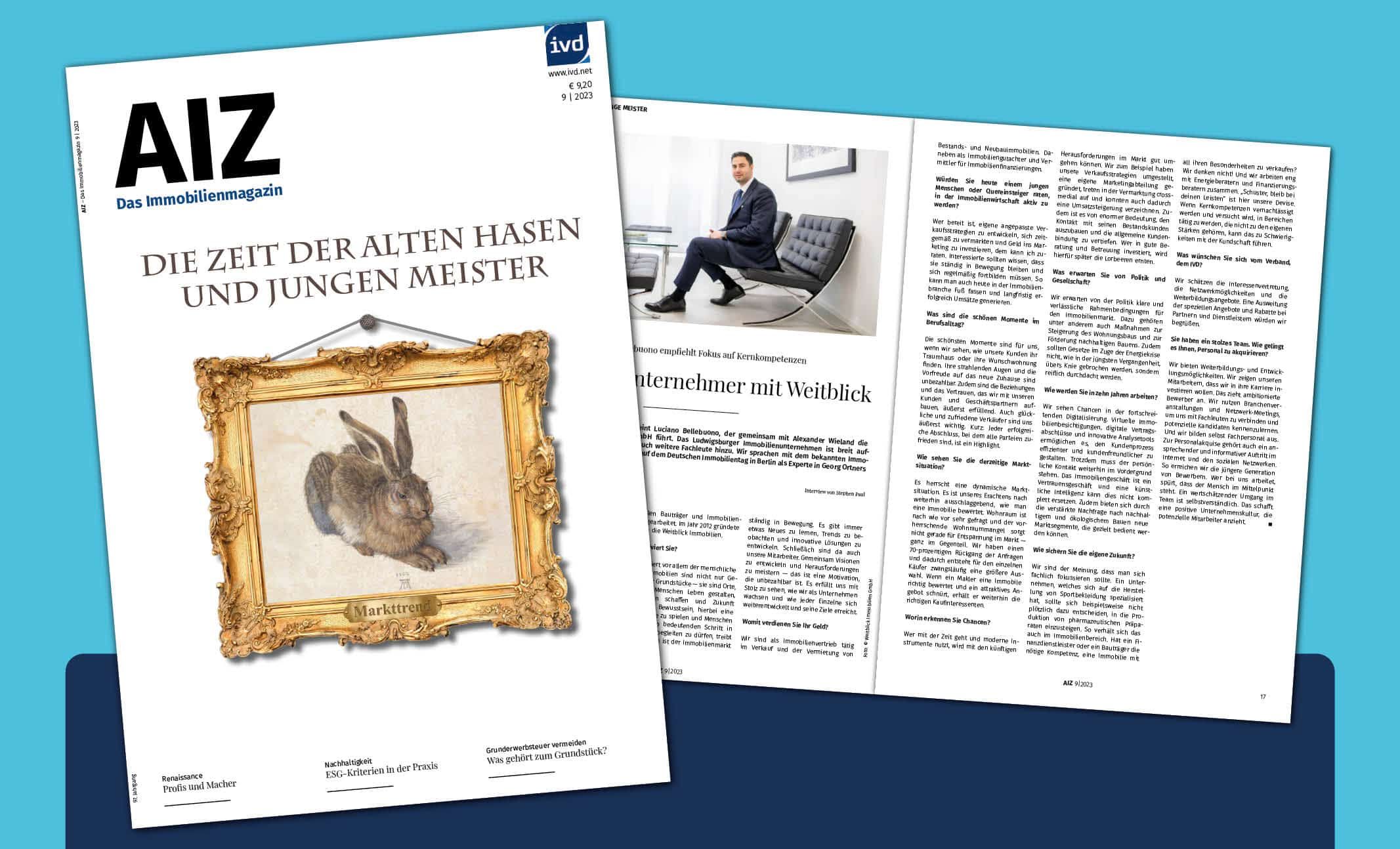 Interview zum aktuellen Markttrend im Immobilienmagazin AIZInterview vom „AIZ – Das Immobilienmagazin“ der Ausgabe 9/2023 mit dem Titelthema „Die Zeit der alten Hasen und jungen Meister“ Luciano Bellebuono empfiehlt Fokus auf Kernkompetenzen Immobilienunternehmer mit Weitblick „Schuster, bleib bei Deinen Leisten“ meint Luciano Bellebuono, der gemeinsam mit Alexander Wieland die Geschäfte der Weitblick Immobilien GmbH führt. Das Ludwigsburger Immobilienunternehmen ist breit aufgestellt, […]