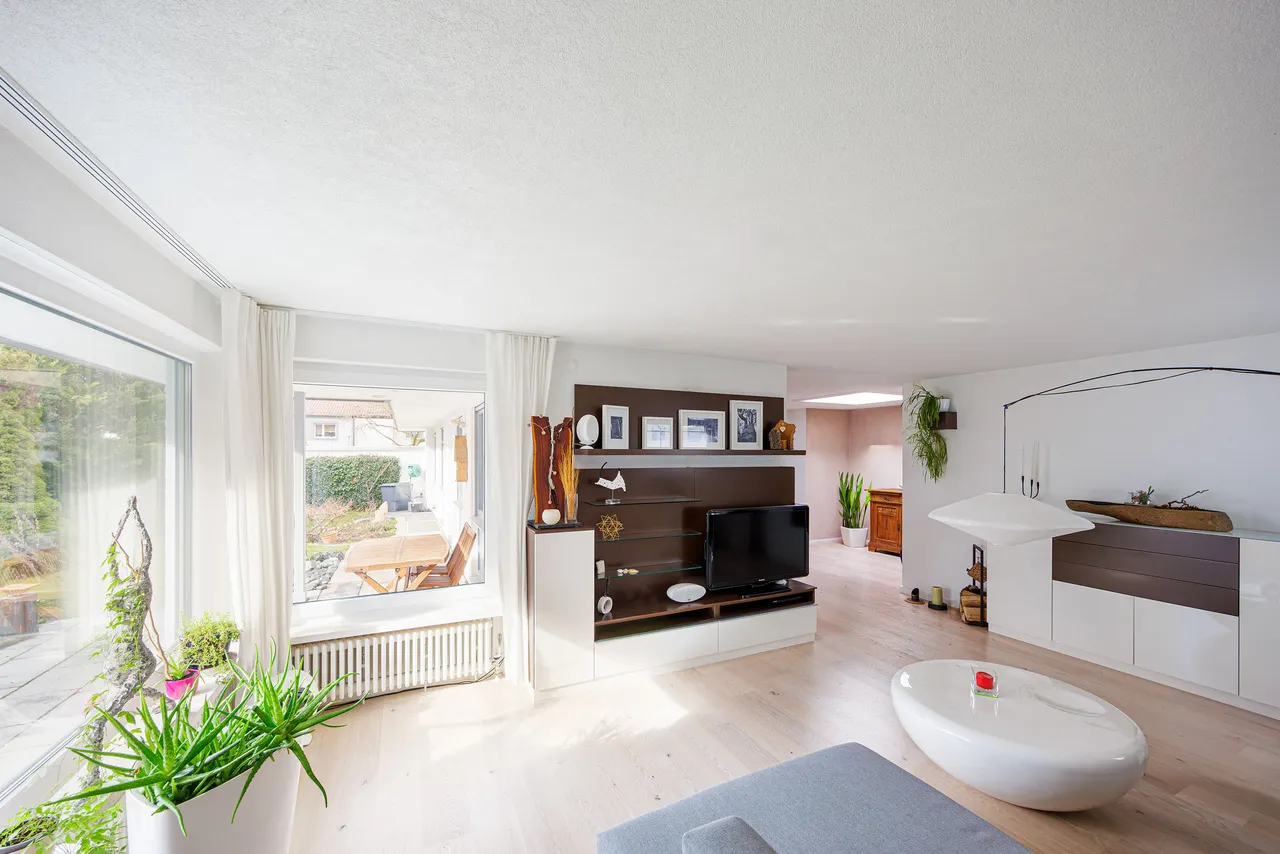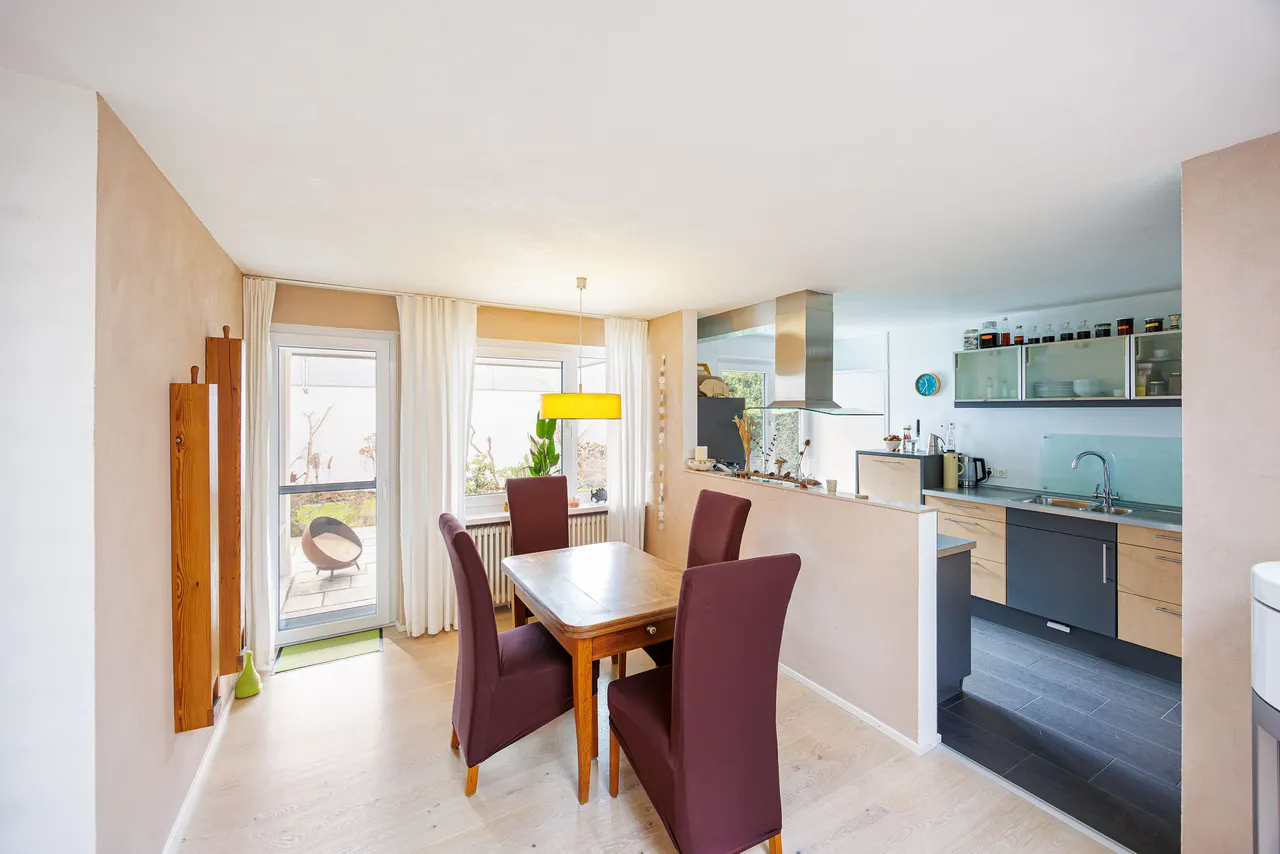 Das Herzstück des Hauses bildet der großzügige Wohn- und Essbereich mit einem 2014 installierten, drehbaren Kaminofen, der für behagliche Wärme und ein besonderes Wohnambiente sorgt. Ein zusätzliches Oberlicht im Esszimmer bringt viel Tageslicht ins Innere und schafft eine helle, freundliche Atmosphäre. Bereits 2010 wurden ca. 80 m² hochwertige Echtholzdielen verlegt, die den Wohnräumen eine warme und elegante Ausstrahlung verleihen.