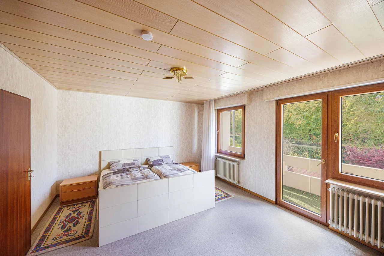 Links vom Flur befindet sich das großzügige Elternschlafzimmer, das mit seiner ruhigen Lage und dem Blick ins Grüne überzeugt. Hier lassen sich problemlos ein großes Doppelbett und ein geräumiger Kleiderschrank unterbringen. Besonders schön ist der direkte Zugang zum Balkon, der nach Westen ausgerichtet ist – ideal, um den Sonnenuntergang zu genießen oder den Tag in entspannter Atmosphäre ausklingen zu lassen.