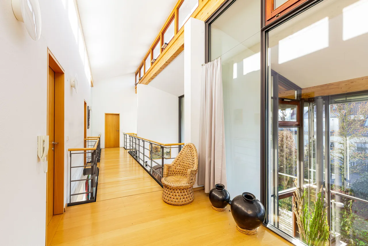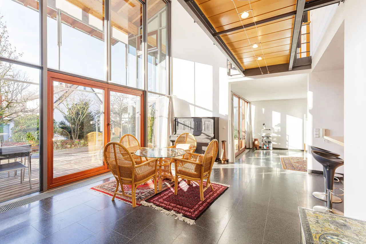 Wir freuen uns, Ihnen diese außergewöhnliche Architektenvilla in Marbach am Neckar präsentieren zu dürfen. Auf insgesamt ca. 260 m² Wohnfläche befinden sich derzeit zwei separate Wohneinheiten, die bei Bedarf problemlos zu einer großen Einheit zusammengeführt werden können. Das gesamte Gebäude besticht durch seine besondere Architektur und den einzigartigen Wohncharakter. Die Villa wurde 1995 von einem Architekten geplant und gebaut – entsprechend prägen stilvolle, moderne Elemente das Erscheinungsbild. Großzügige Glasfronten in südlicher Ausrichtung bilden die Grundlage für ein modernes, energieeffizientes Wohnkonzept. Sie lassen reichlich Tageslicht in die Räume strömen, schaffen ein helles, freundliches Ambiente und verleihen dem Zuhause ein außergewöhnliches Wohngefühl mit hoher Aufenthaltsqualität. Ergänzend dazu ist die Südseite mit einem effektiven Sonnenschutz ausgestattet, der den Innenraum vor übermäßiger Hitze und zu starker Sonneneinstrahlung schützt und so auch an warmen Tagen ein angenehmes Raumklima gewährleistet.