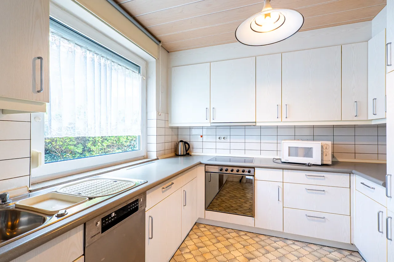 Zur linken Seite öffnet sich die geräumige, lichtdurchflutete Küche, die mit ihrer angenehmen Größe und ihrem funktionalen Schnitt überzeugt. Der direkte Übergang in den angrenzenden Essbereich schafft eine harmonische Verbindung zwischen Kochen und gemeinsamen Mahlzeiten. Dieser Bereich eignet sich ideal für gesellige Familienessen, gemütliche Abende mit Freunden oder auch den entspannten Start in den Tag bei einem gemeinsamen Frühstück.