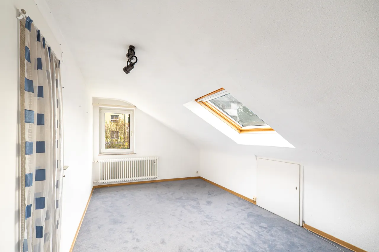 Über eine weitere Treppe erreicht man das Dachgeschoss, das mit seinem besonderen Charme und vielfältigen Nutzungsmöglichkeiten punktet. Zwei individuell nutzbare Räume eröffnen zahlreiche Gestaltungsmöglichkeiten, sei es als Hobbyraum, Arbeitsbereich, Gästezimmer oder zusätzlicher Wohnraum. Ein weiteres WC auf dieser Ebene sorgt für zusätzlichen Komfort und macht das Dachgeschoss besonders attraktiv für größere Familien oder längere Besuche.