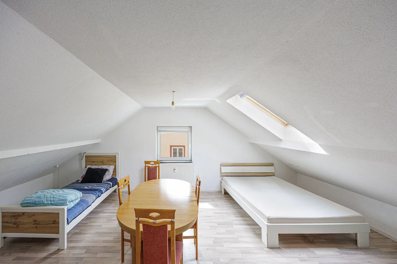 Das Dachgeschoss beherbergt eine kompakte, ca. 30 m² große 1-Zimmer-Wohnung mit offenem Wohn- und Schlafbereich, integrierter Küchenzeile und einem hellen Tageslichtbad mit Dusche. Sie ist derzeit für 550 € kalt vermietet und eignet sich hervorragend für Singles oder Wochenendpendler. Aufgrund ihrer effizienten Raumaufteilung war sie bislang stets problemlos zu vermieten.