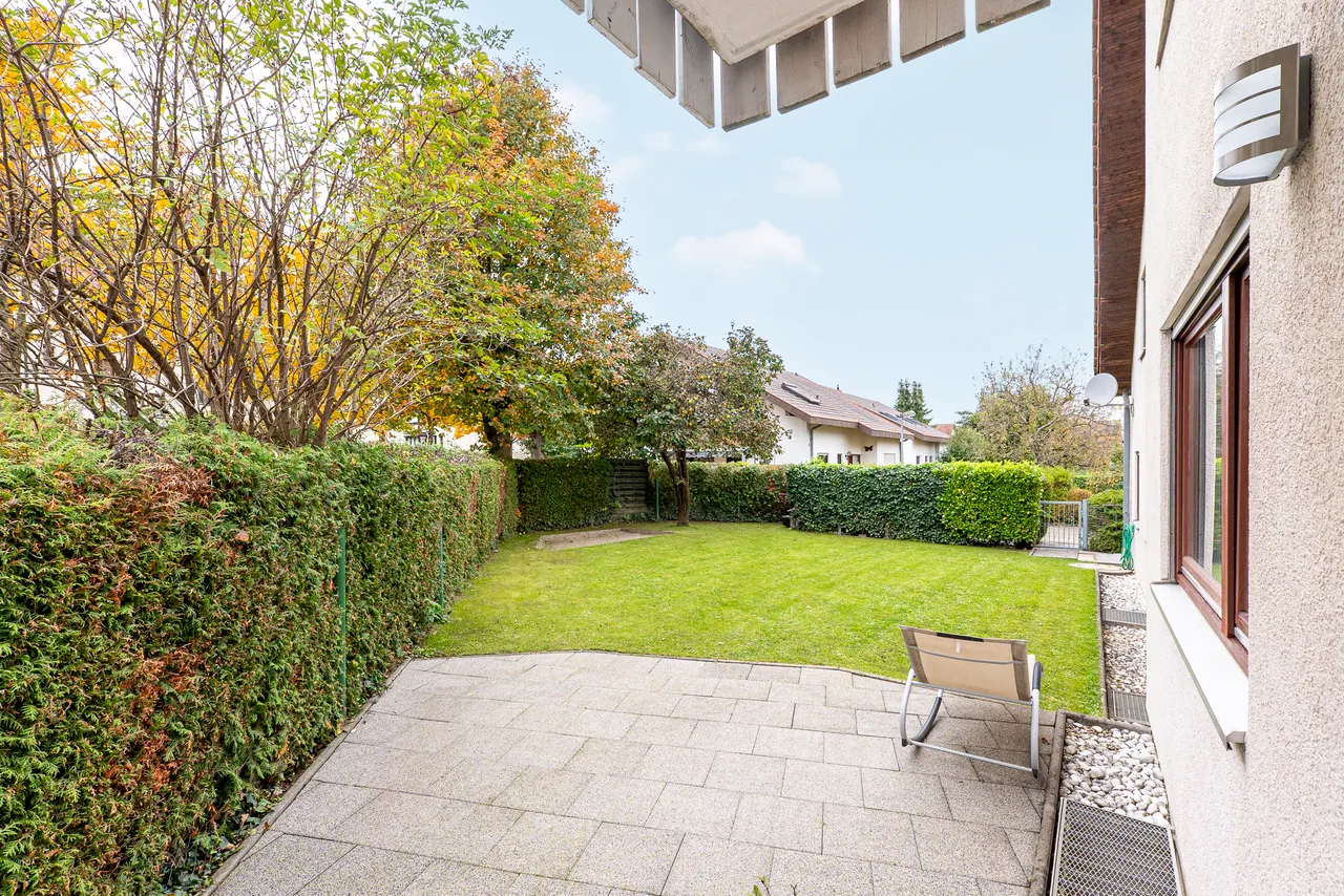 Am Ende des Flurs liegt das großzügige Wohn- und Esszimmer, das mit seinem Licht und seiner Weite begeistert. Große Fensterflächen lassen die Sonne herein und schaffen eine warme, einladende Atmosphäre. Hier kann man entspannte Familienabende verbringen, Feste feiern oder einfach auf dem Sofa sitzen und den Blick in den Garten genießen. Von hier aus gelangen Sie direkt auf die Terrasse, die sich ideal zum Frühstücken im Freien oder für gemütliche Grillabende eignet. Der angrenzende Garten bietet ausreichend Platz zum Spielen, Toben oder Entspannen – ein Paradies für Kinder und Eltern gleichermaßen.
