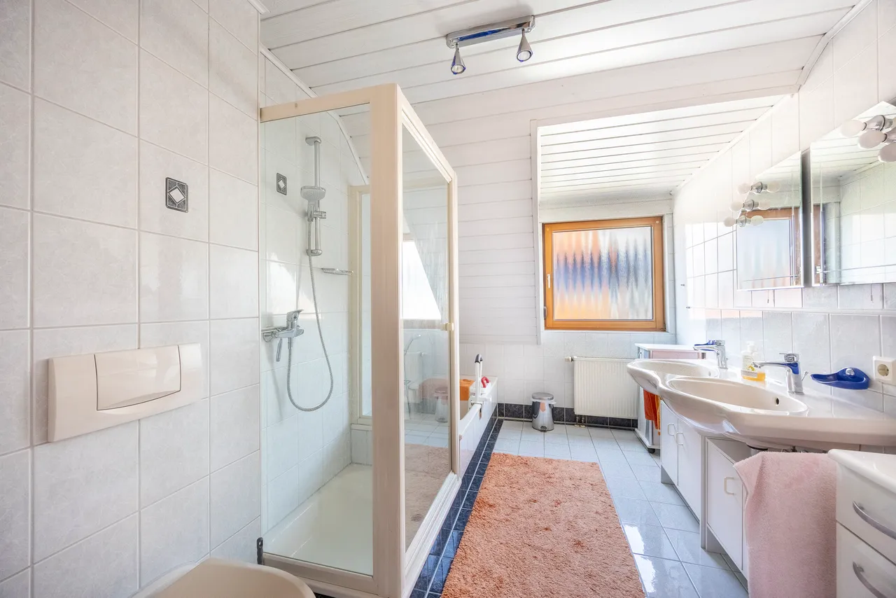 Über die zentral platzierte Treppe erreicht man das Dachgeschoss, das als privater Rückzugsort dient. Drei gut geschnittene Zimmer lassen sich flexibel als Schlaf-, Kinder-, Gästezimmer oder Büro nutzen. Sichtbalken und Dachschrägen verleihen den Räumen einen besonderen Charme. Das Tageslichtbad mit Wanne, Dusche, Doppelwaschtisch und WC bietet eine helle und freundliche Atmosphäre – perfekt für einen entspannten Start in den Tag.