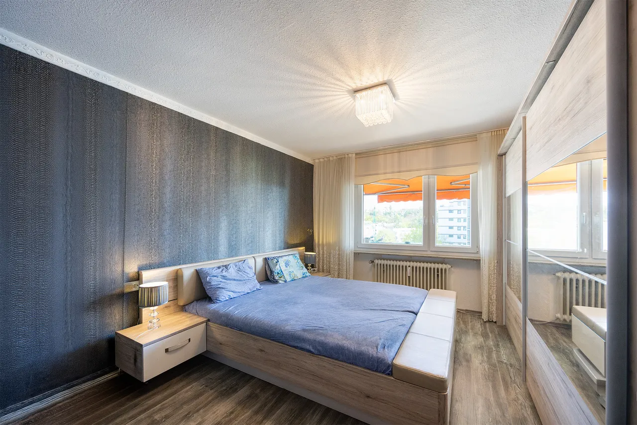 Auf der rechten Seite des kleinen Flurs liegt das Schlafzimmer, das hell und großzügig geschnitten ist und Platz für ein Doppelbett sowie einen großen Kleiderschrank bietet. Auch hier besteht direkter Zugang zum nach Süden ausgerichteten Balkon.