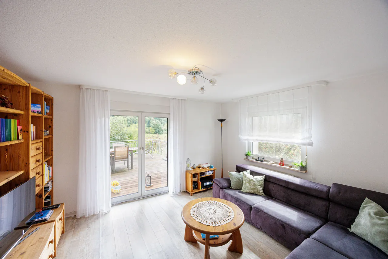 Beim Betreten des Hauses empfängt Sie rechter Hand ein Gäste-WC, bevor sich der Blick in Richtung des Wohn- und Essbereichs öffnet. Das helle Wohnzimmer lädt zusammen mit dem angrenzenden Esszimmer zu entspannten Stunden mit Familie und Freunden ein. Die große Terrasse ist sowohl vom Wohn- als auch vom Essbereich aus direkt zugänglich und bietet somit vielfältige Möglichkeiten für gemütliche Stunden im Freien. Über die Terrasse gelangen Sie in den weitläufigen und gepflegten Garten – ein idealer Ort zum Entspannen, Spielen oder für gesellige Zusammenkünfte. Die funktional geschnittene Küche erfüllt sowohl die alltäglichen Anforderungen als auch gehobene Ansprüche. Ergänzt wird diese Ebene durch ein weiteres Schlafzimmer sowie ein Badezimmer. Besonders komfortabel: die direkt ins Haus integrierte Garage, die Ihnen kurze Wege garantiert und den Alltag spürbar erleichtert.