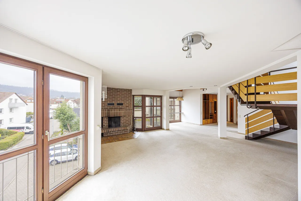 Durch die Haupteingangstür der Wohneinheit gelangen Sie in einen großzügigen Flur, der Sie direkt in den weitläufigen Wohnbereich führt. Hier erleben Sie eine offene und helle Atmosphäre, die durch die großen Fensterfronten unterstrichen wird. Der Wohnbereich mit Kamin lädt zu gemütlichen Abenden ein und bietet direkten Zugang zur großen Süd-West-Dachterrasse, auf der Sie die Sonne bis in die Abendstunden genießen können.