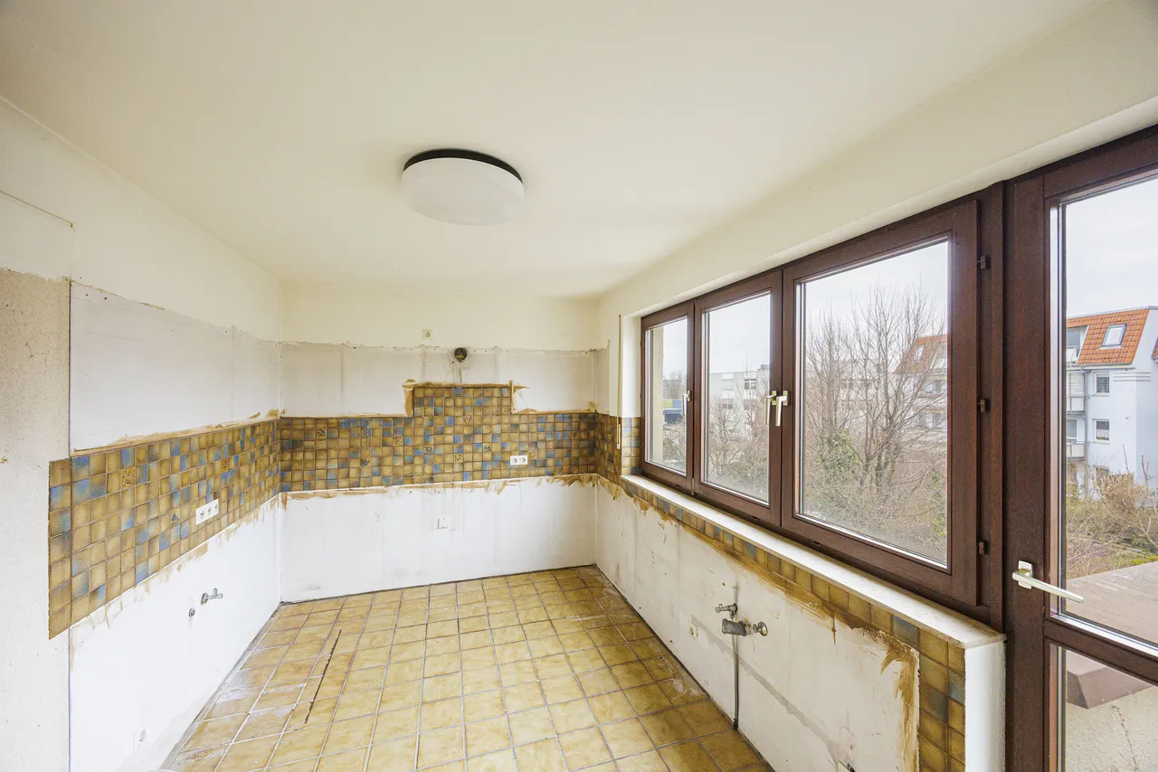 Die Küche ist ebenfalls großzügig geschnitten und bietet Platz für kulinarische Entfaltung. Ein direkter Zugang zum Ost-Balkon ermöglicht ein Frühstück mit Morgensonne. Ergänzt wird das Raumangebot im unteren Bereich der Wohnung durch eine praktische Abstellkammer sowie ein Gäste-WC.