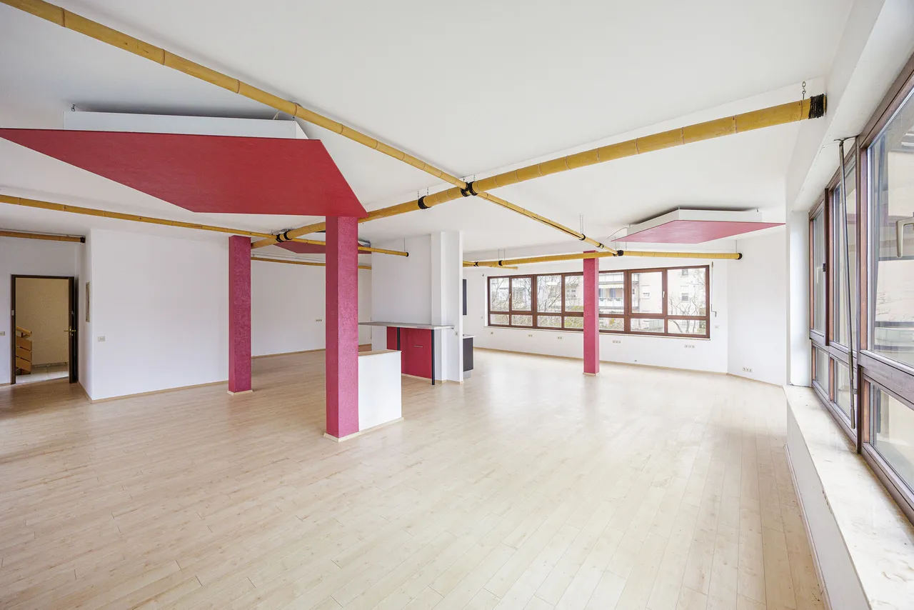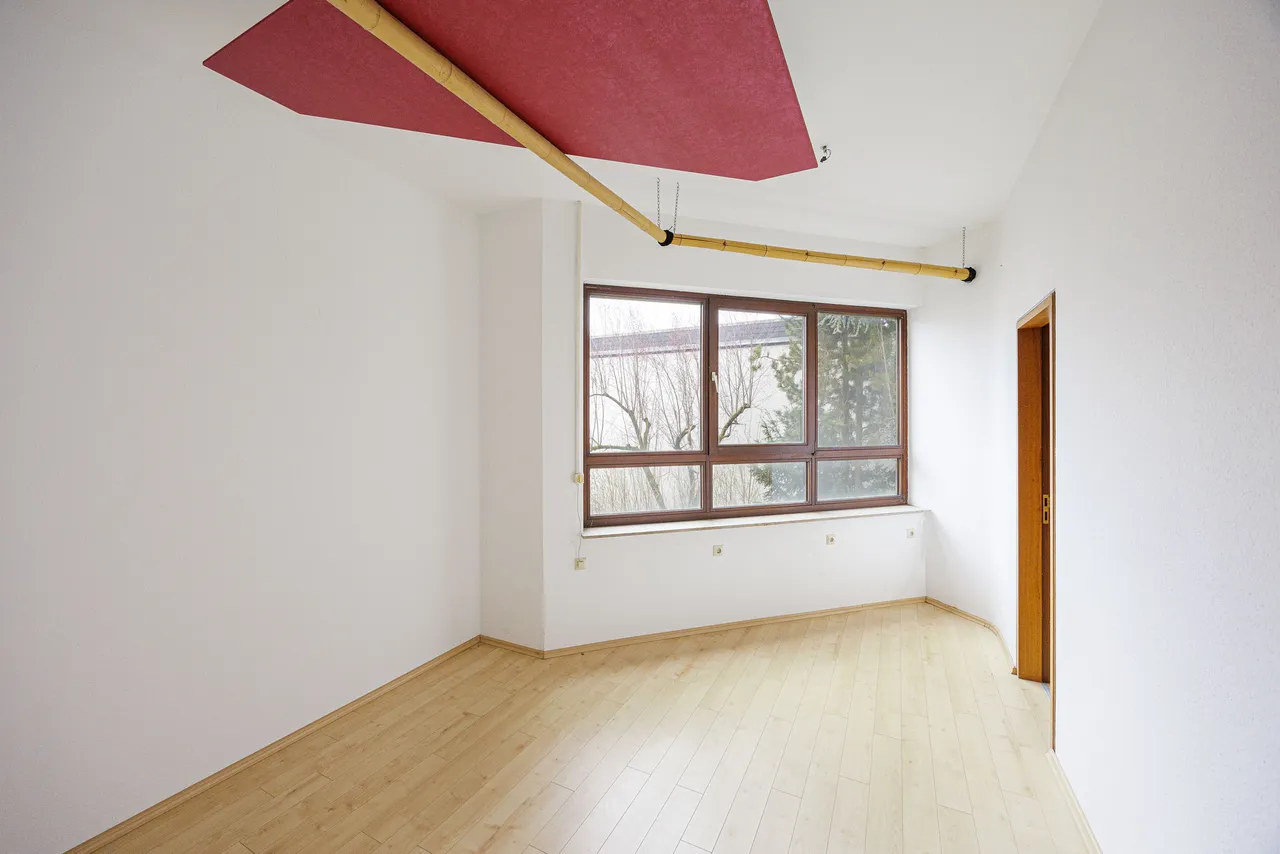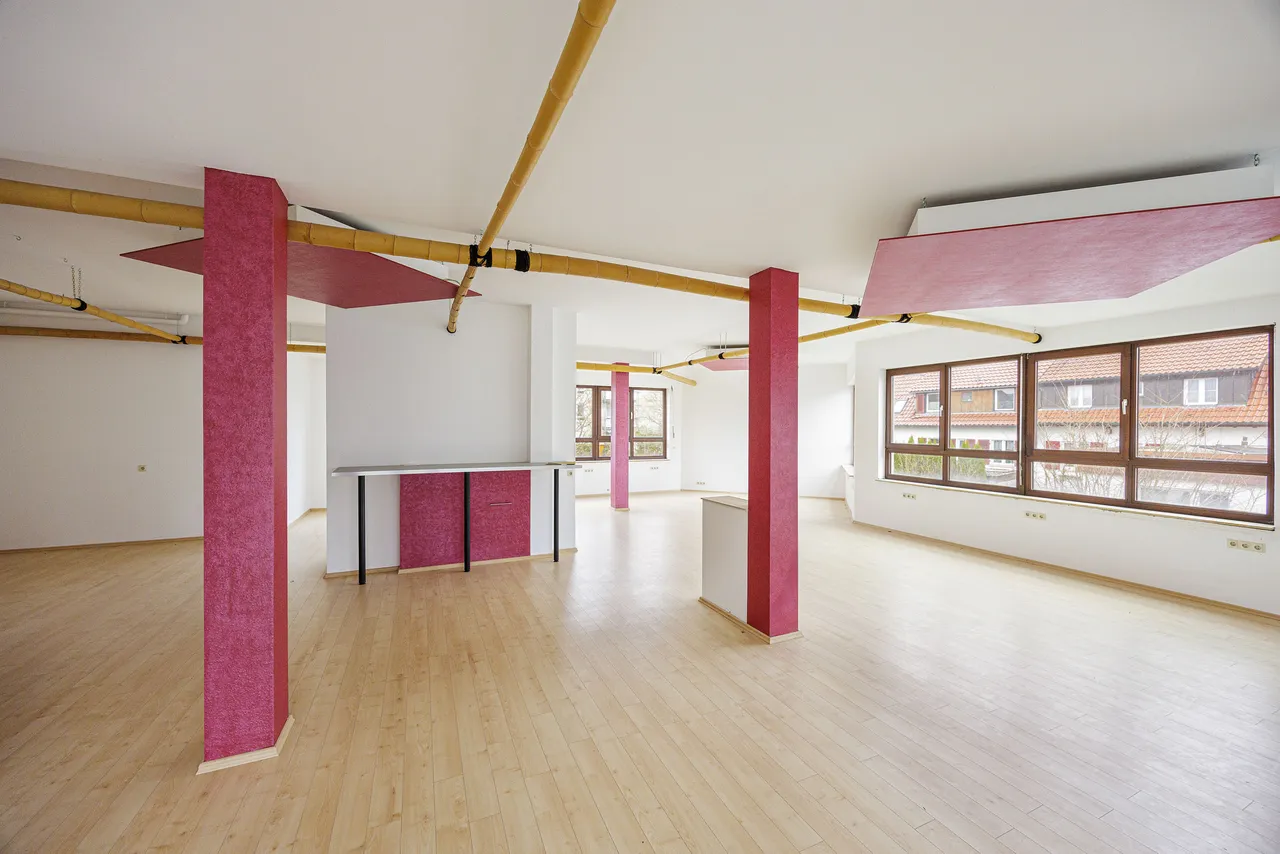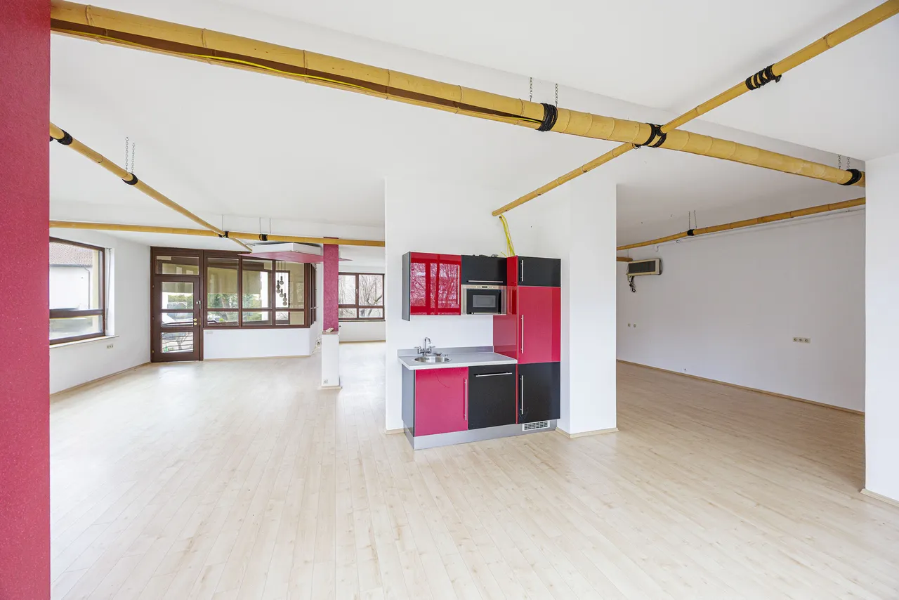 Das erste Obergeschoss ist vollständig der Gewerbefläche gewidmet und besticht durch große Verglasungen, die für eine helle und freundliche Atmosphäre sorgen. Die Fläche bietet eine integrierte Küchenzeile und kann flexibel genutzt werden – sei es als Büro, Praxis, Atelier oder Ausstellungsfläche. Ein separates Büro innerhalb der Gewerbeeinheit ermöglicht einen ruhigen Rückzugsort für konzentriertes Arbeiten und verfügt über einen zusätzlichen Raum, der individuell gestaltet werden kann – beispielsweise als Archiv, Lager oder Besprechungszimmer.