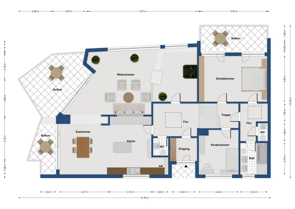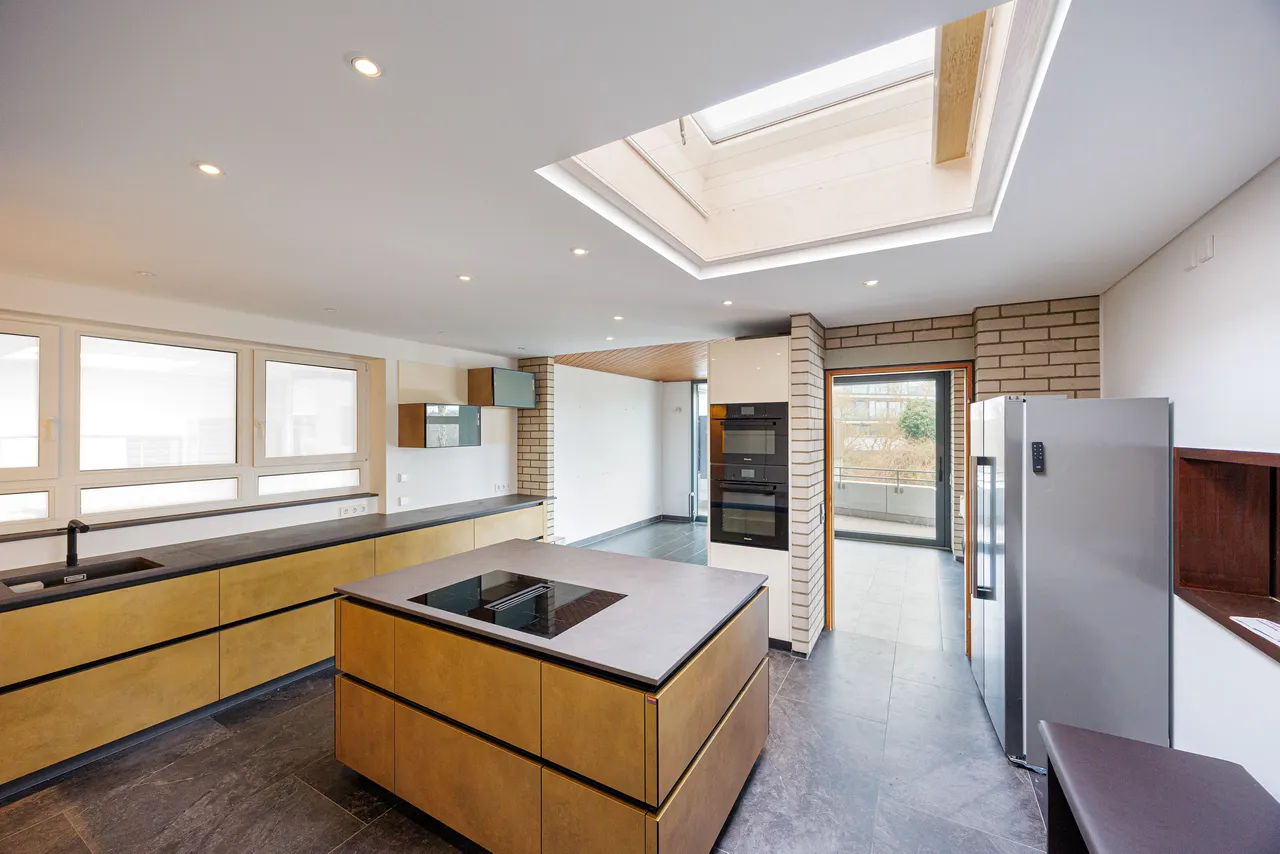 Bereits die Ankunft unterstreicht den besonderen Charakter dieser Immobilie: Eine eigene Garage mit direktem Zugang zur Terrasse sowie zwei separate Außenstellplätze bieten komfortable Parkmöglichkeiten für Bewohner und Gäste. Über den privaten Hauseingang betreten Sie die Wohnung und gelangen in den einladenden Eingangsbereich mit Garderobe, der einen klar strukturierten Übergang in die Wohnbereiche schafft. Auf dieser Hauptebene erschließen sich zwei großzügige, voneinander getrennte Räume: die abgeschlossene Küche mit viel Platz für gemeinsames Kochen, Essen und Familienleben mit angrenzendem Essplatz, sowie das beeindruckende Wohnzimmer als eigenständiger Wohnbereich. Das Wohnzimmer ist im eleganten Split-Level-Design gestaltet und vermittelt durch seine Offenheit und Raumhöhe ein außergewöhnliches Wohngefühl. Großzügige Fensterflächen inszenieren die spektakuläre Aussicht wie ein lebendiges Landschaftsbild und lassen Innen- und Außenraum harmonisch ineinander übergehen. Von hier aus betreten Sie direkt die weitläufige Sonnenterrasse – einen der eindrucksvollsten Bereiche der Wohnung –, die mit ihrem Panorama über das Wiesental und die Enz zu entspannten Stunden im Freien, geselligen Abenden oder repräsentativen Empfängen einlädt.