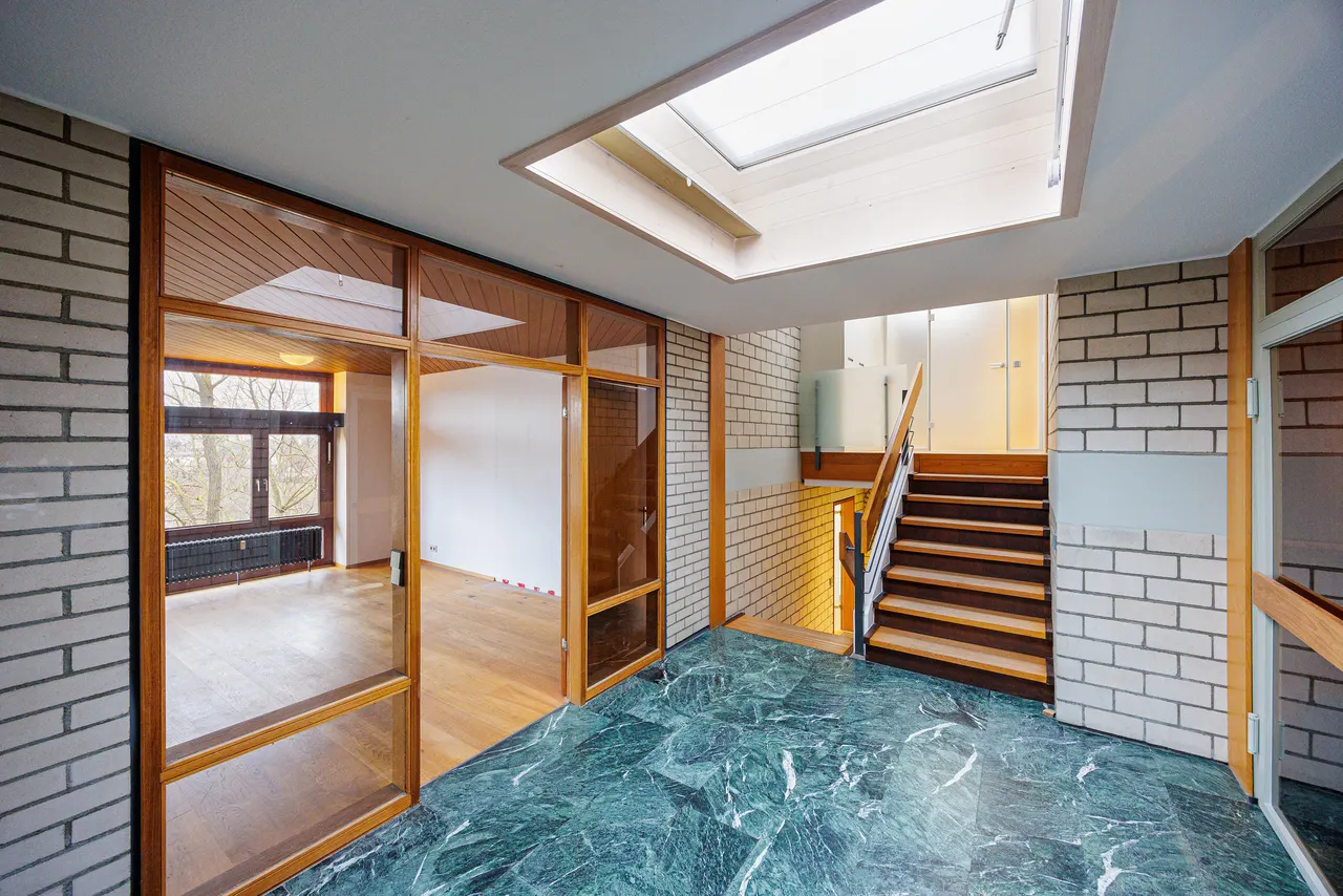 Eine halbe Ebene oberhalb befindet sich ein flexibel nutzbares Zimmer, das sich ideal als Kinder-, Gäste- oder Arbeitszimmer eignet und damit kurze Wege zum Wohnbereich bietet. Der anschließende, bewusst abgetrennte Schlafbereich gewährleistet ein hohes Maß an Ruhe und Privatsphäre und verfügt über ein komfortables Badezimmer auf dieser Ebene.