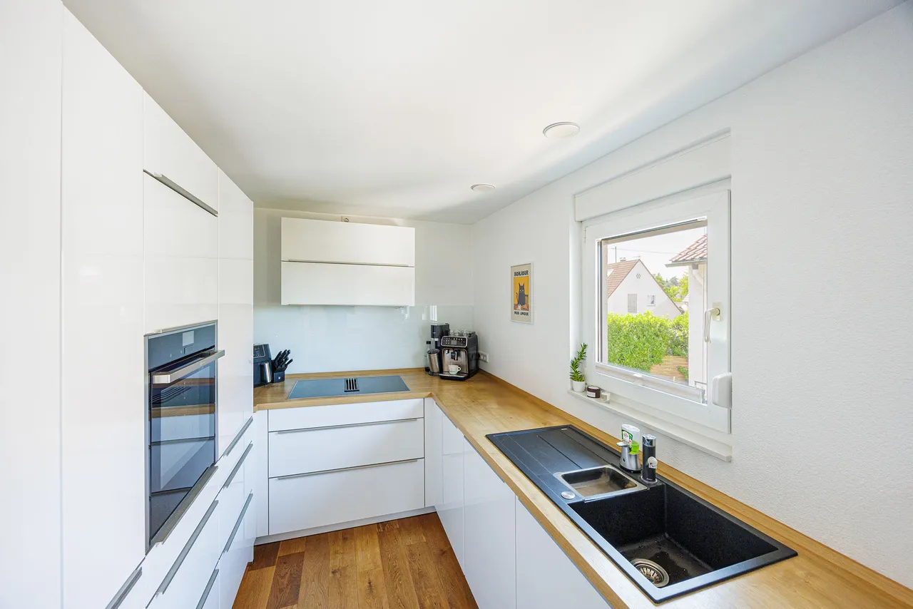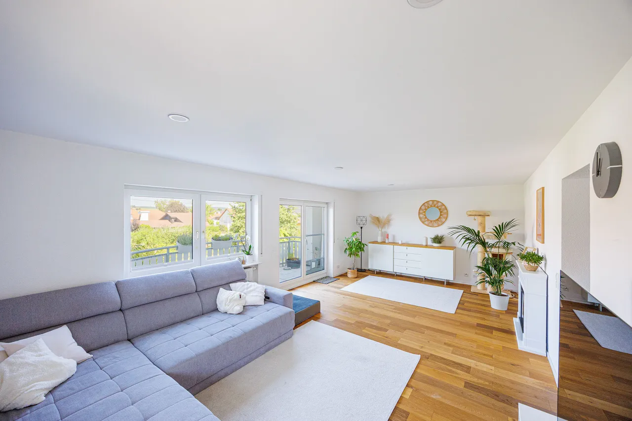 Zur rechten Seite des Flurs gelangen Sie in den offenen Koch- und Essbereich. Die moderne Einbauküche aus dem Jahr 2019 ist nicht nur funktional, sondern auch optisch ein echtes Highlight. Sie bietet viel Stauraum, hochwertige Elektrogeräte und lädt zum gemeinsamen Kochen und Genießen ein. Der angrenzende Essbereich schafft eine angenehme Atmosphäre für gesellige Abende mit Familie oder Freunden. Vom Essbereich aus gelangen Sie in das großzügige Wohnzimmer, das mit seinem modernen Stil eine gemütliche und gleichzeitig elegante Wohlfühlatmosphäre schafft. Große Fensterflächen sorgen für viel Tageslicht und eröffnen den Blick auf den eigenen Balkon, der sich direkt ans Wohnzimmer anschließt. Von hier aus genießen Sie die Aussicht auf den im Jahr 2021 neu ausgelegten Garten.