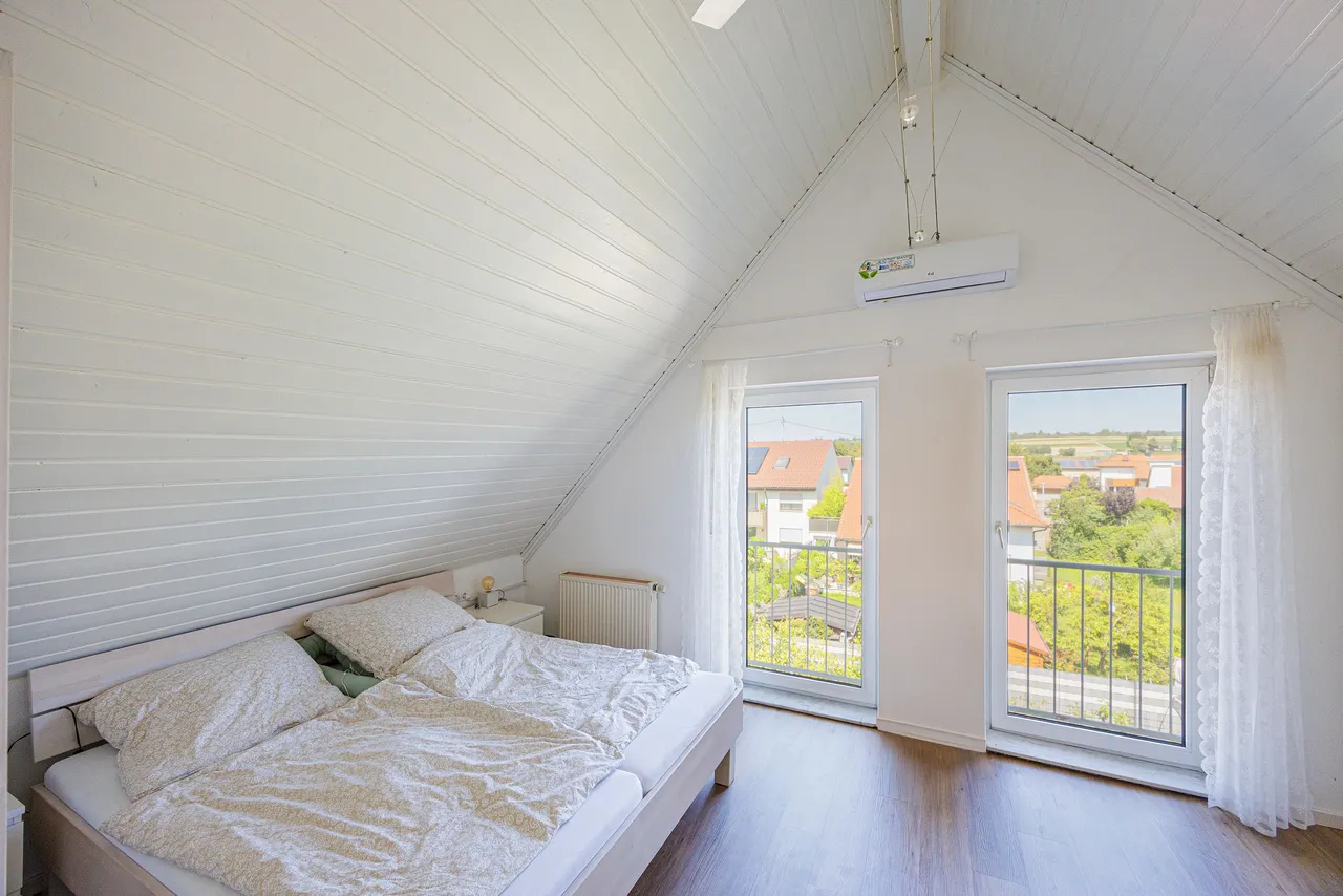 Im Dachgeschoss der Wohnung erwarten Sie zwei weitere Zimmer. Das derzeit als Schlafzimmer genutzte Zimmer ist großzügig geschnitten und bietet ebenfalls einen herrlichen Blick in den Garten. Das zweite Zimmer auf dieser Etage wird aktuell als Abstellraum genutzt, bietet jedoch großes Potenzial für den Ausbau, beispielsweise als weiteres Kinderzimmer, Büro oder Hobbyraum.