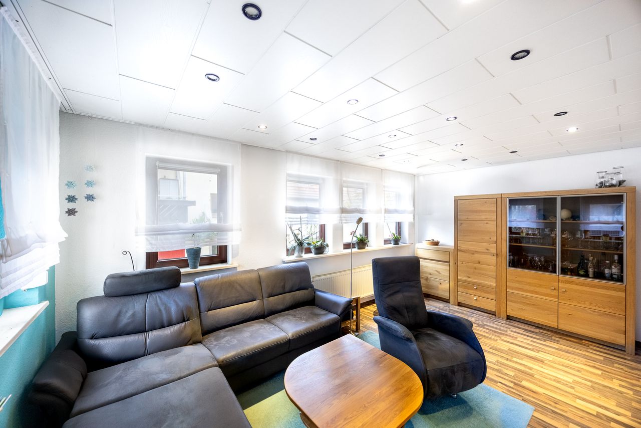 Zurück im Eingangsbereich führt eine Treppe rechter Hand in das Obergeschoss, den zentralen Lebensmittelpunkt des Hauses. Oben angekommen, befindet sich zunächst ein separates WC, praktisch gelegen und angenehm vom übrigen Wohnbereich abgetrennt. Linker Hand betreten Sie das helle und großzügige Wohnzimmer. Große Fensterflächen sorgen hier für eine freundliche, lichtdurchflutete Atmosphäre. Dieser Raum bietet vielfältige Gestaltungsmöglichkeiten, eine gemütliche Sofalandschaft, eine Leseecke oder ein stilvoller Wohnbereich für gesellige Abende finden hier mühelos ihren Platz.