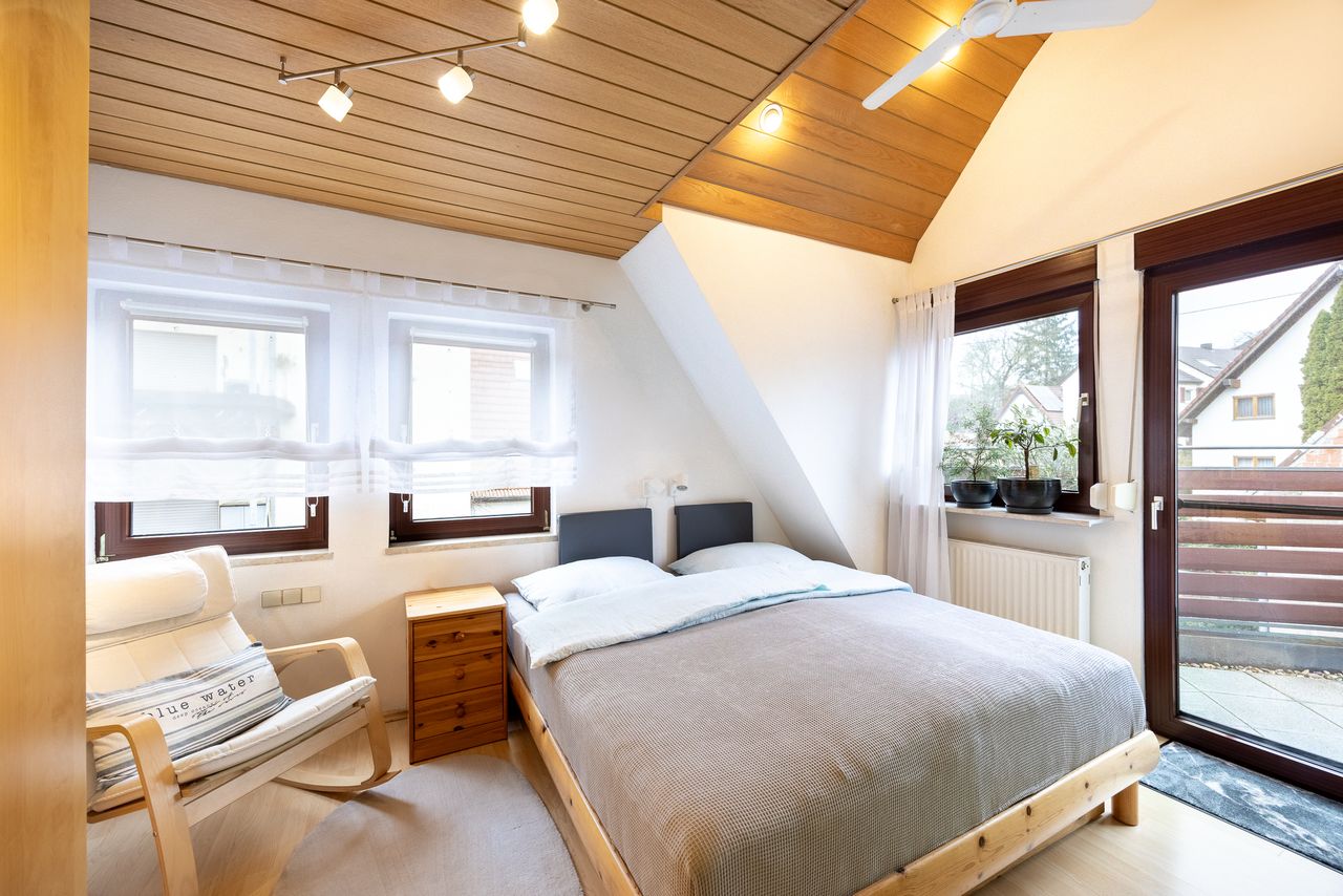 Das Hauptschlafzimmer überzeugt durch seine schöne Deckenhöhe, die dem Raum eine besondere Großzügigkeit verleiht. Hier entsteht ein ruhiger, privater Rückzugsort mit ganz eigenem Charme. Ein weiteres Highlight ist der direkte Zugang zu einem zusätzlichen Balkon, perfekt um den Tag mit frischer Luft zu beginnen.