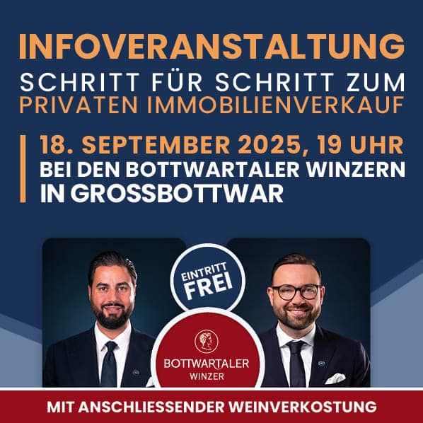 Wenn Sie den Verkauf Ihrer Immobilie ohne Makler in die Hand nehmen möchten, laden wir Sie herzlich ein zu unserem kostenfreien Infoabend am Donnerstag, 18. September 2025 um 19 Uhr bei den Bottwartaler Winzern in Großbottwar.