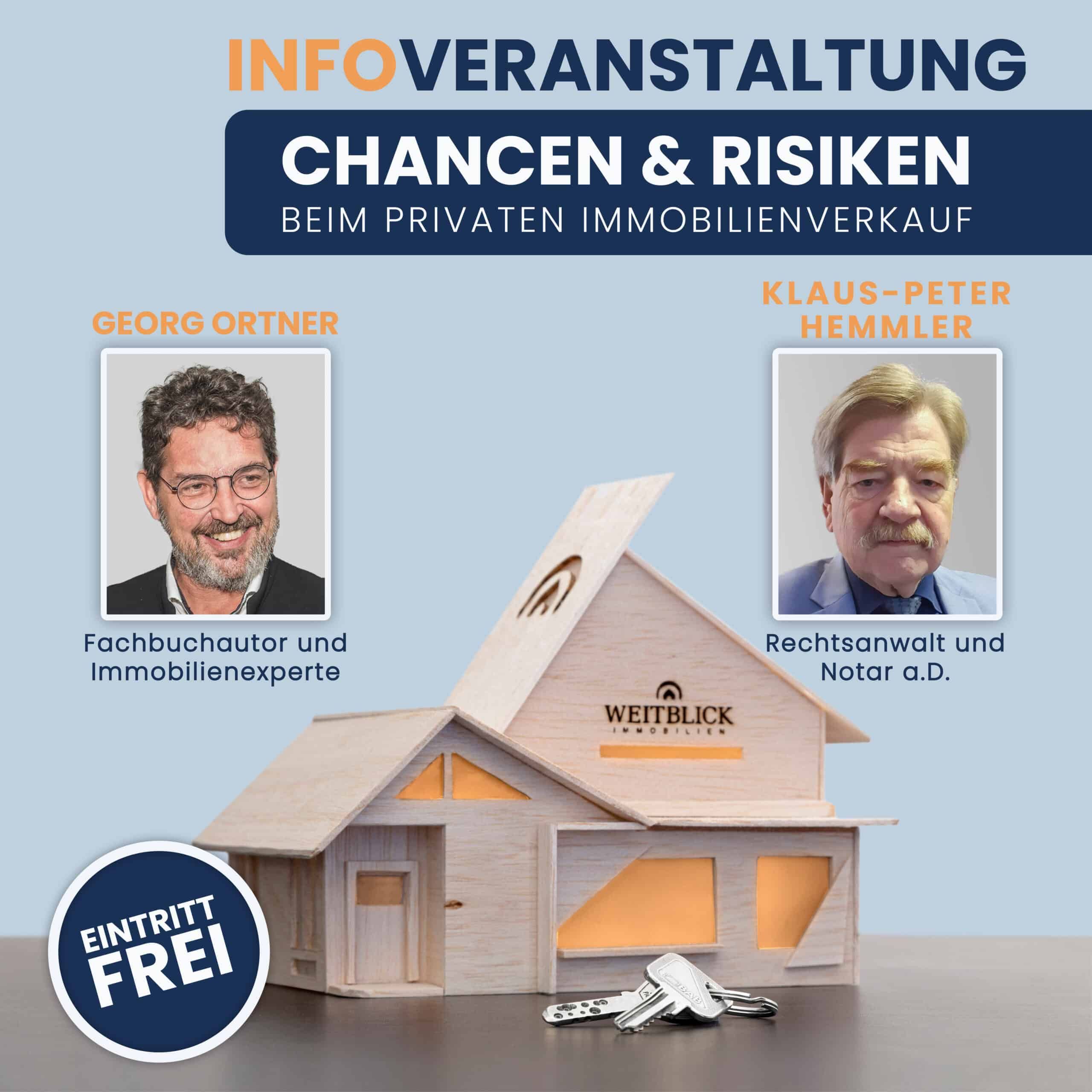 Neben allen Informationen zur aktuellen Marktsituation, die Ihnen die Geschäftsführung der Ludwigsburger Immobilienexperten von WEITBLICK aufzeigen, wird Sie der Fachbuchautor und Immobilienexperte, Georg Ortner, umfassend über die Chancen & Risiken beim privaten Immobilienverkauf aufklären. Zudem wird der erfahrene Rechtsanwalt und Notar a.D., Klaus-Peter Hemmler, über die Fallstricke beim Grundstücksverkauf berichten und Ihnen rechtliche Ratschläge mit auf Ihren künftigen Weg geben.
