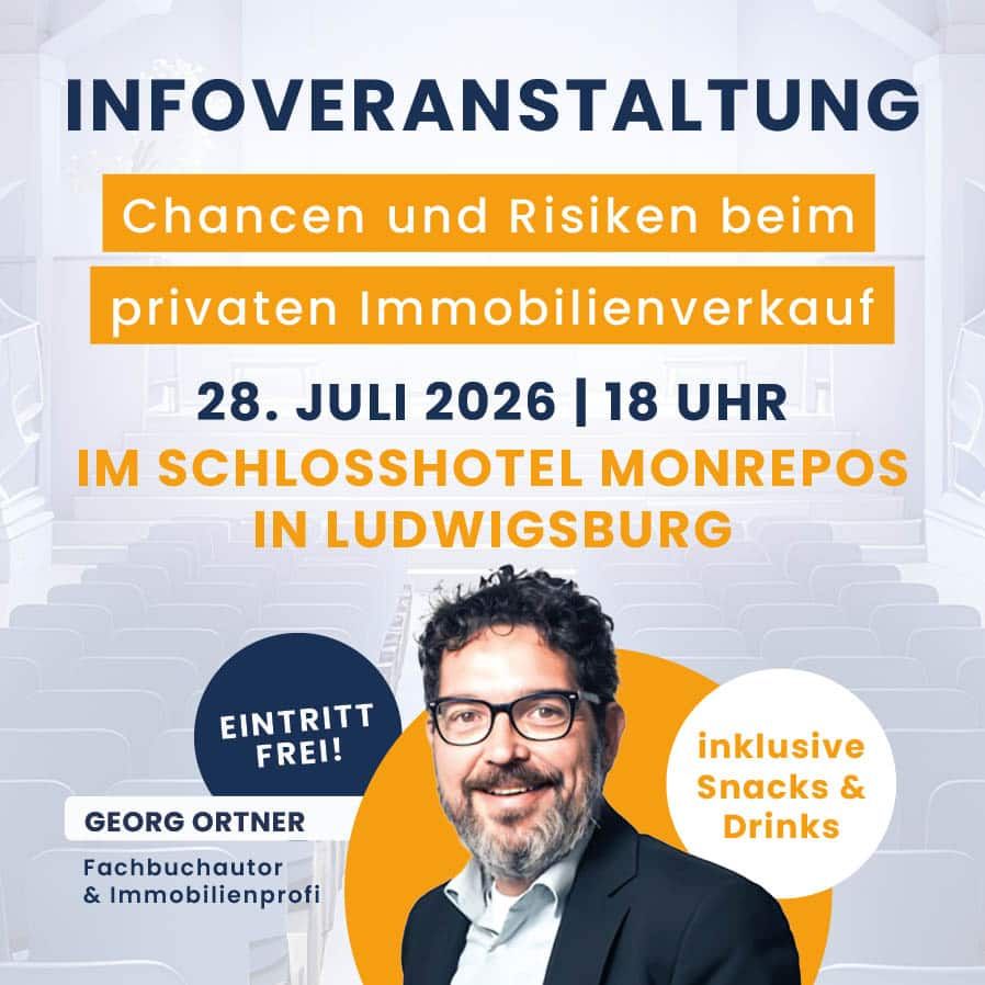 Sie sind Eigentümer einer Immobilie und möchten fundierte Entscheidungen treffen – ganz gleich, ob ein Verkauf bereits konkret geplant ist oder noch in weiter Ferne liegt? Dann besuchen Sie unseren Informationsabend am Dienstag, 28. Juli 2026, um 18 Uhr im Schlosshotel Monrepos in Ludwigsburg.